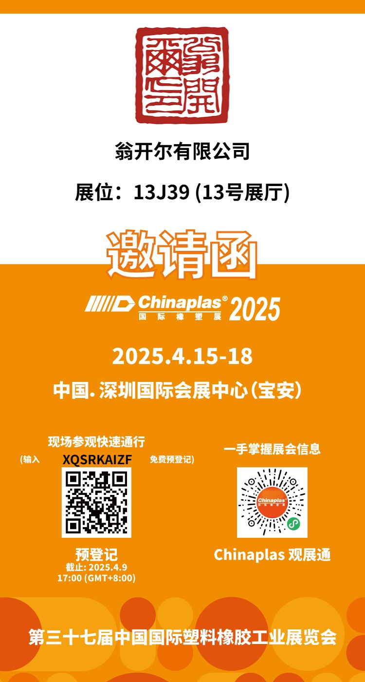 翁開爾誠邀您蒞臨參觀 CHINAPLAS 國際橡塑展